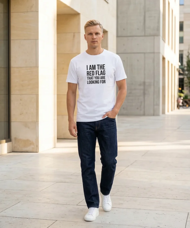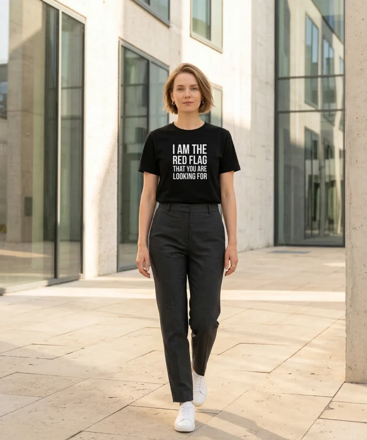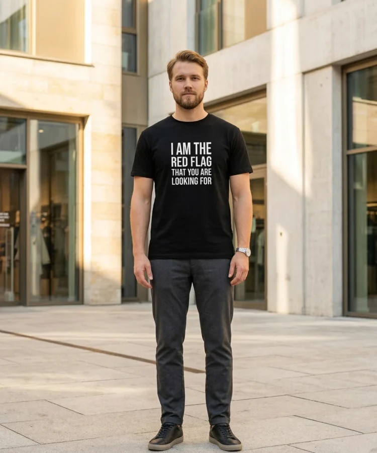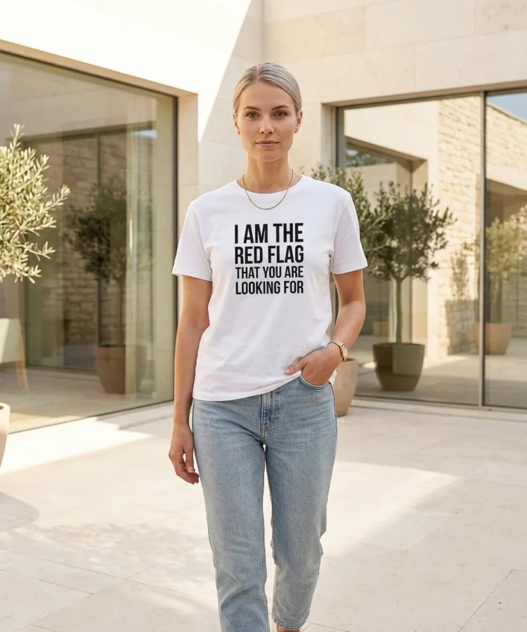 I AM THE RED FLAG THAT YOU ARE LOOKING FOR — kui hoiatavad sildid oleks moes, näeksid need välja täpselt sellised. See särk on aus enesetutvustus inimesele, kes teab, et natuke kaost teeb elu huvitavaks.