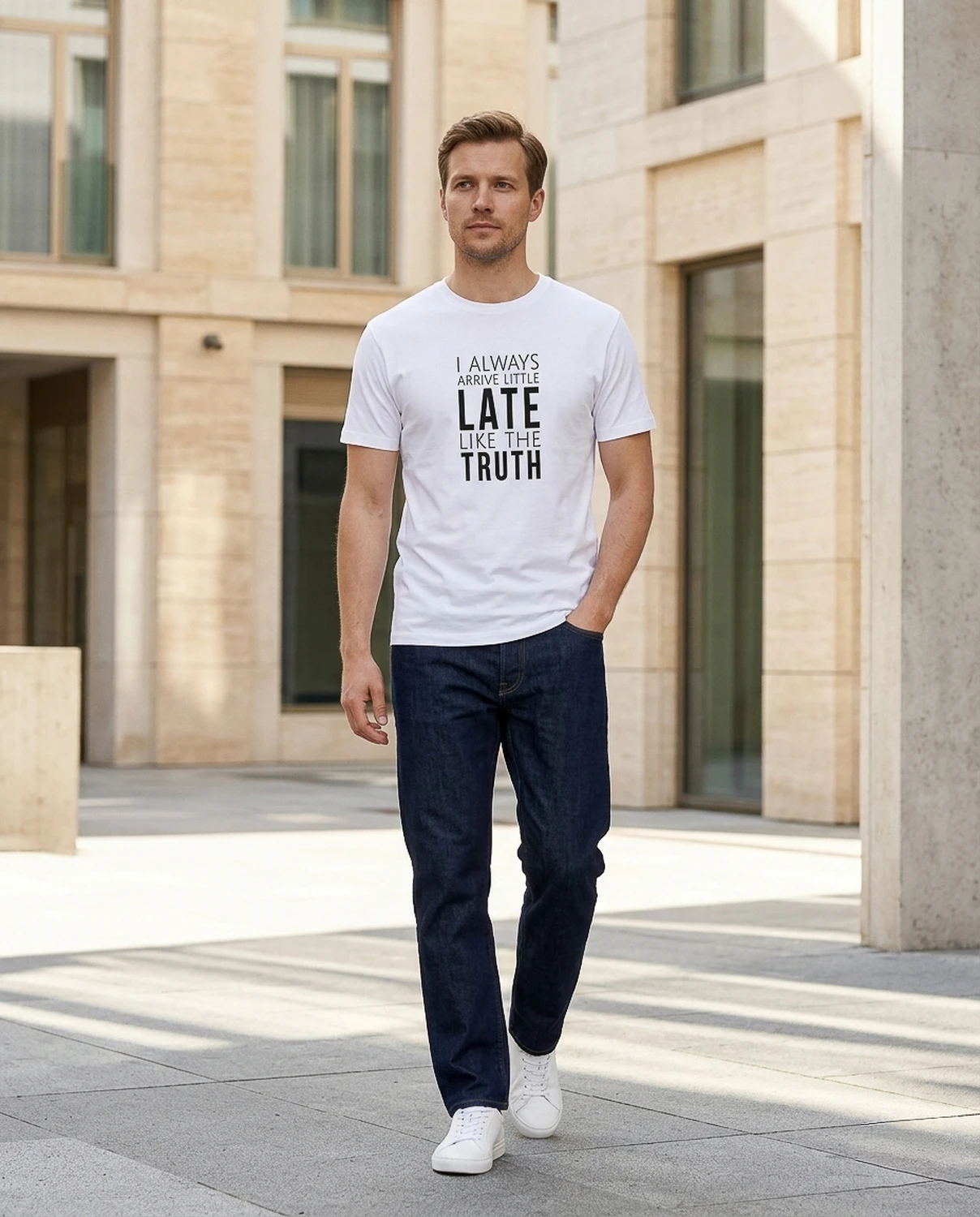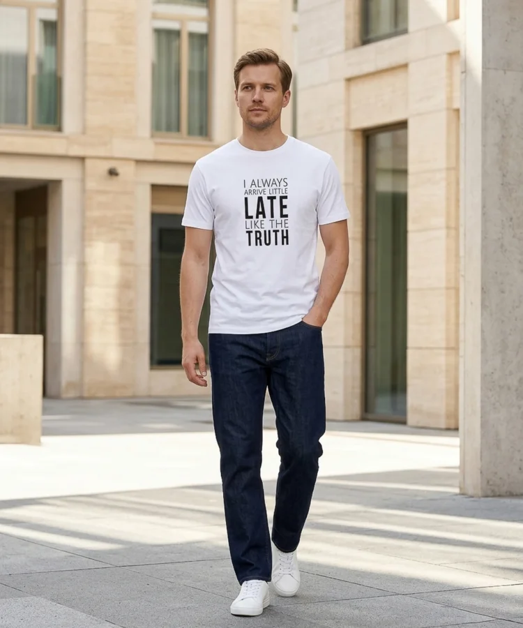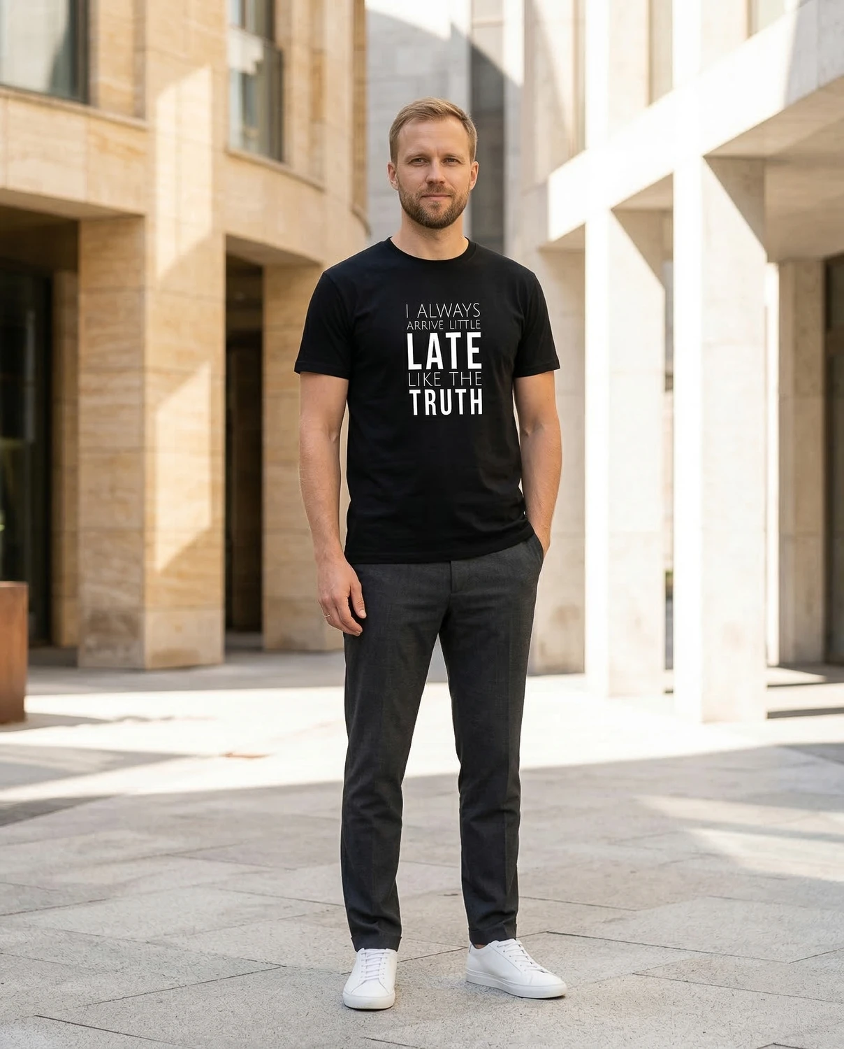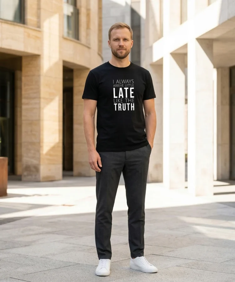 See on Always Late suurem vend. Kui lühike versioon on nali, siis see on nali koos sügavusega. Pikem lause, suurem mõju — kroonilistele hilinejatele, kes tahavad oma ajatunnetust stiilselt põhjendada. Kink kellelegi, kes on alati viis minutit hilja, aga kellel on alati hea selgitus.