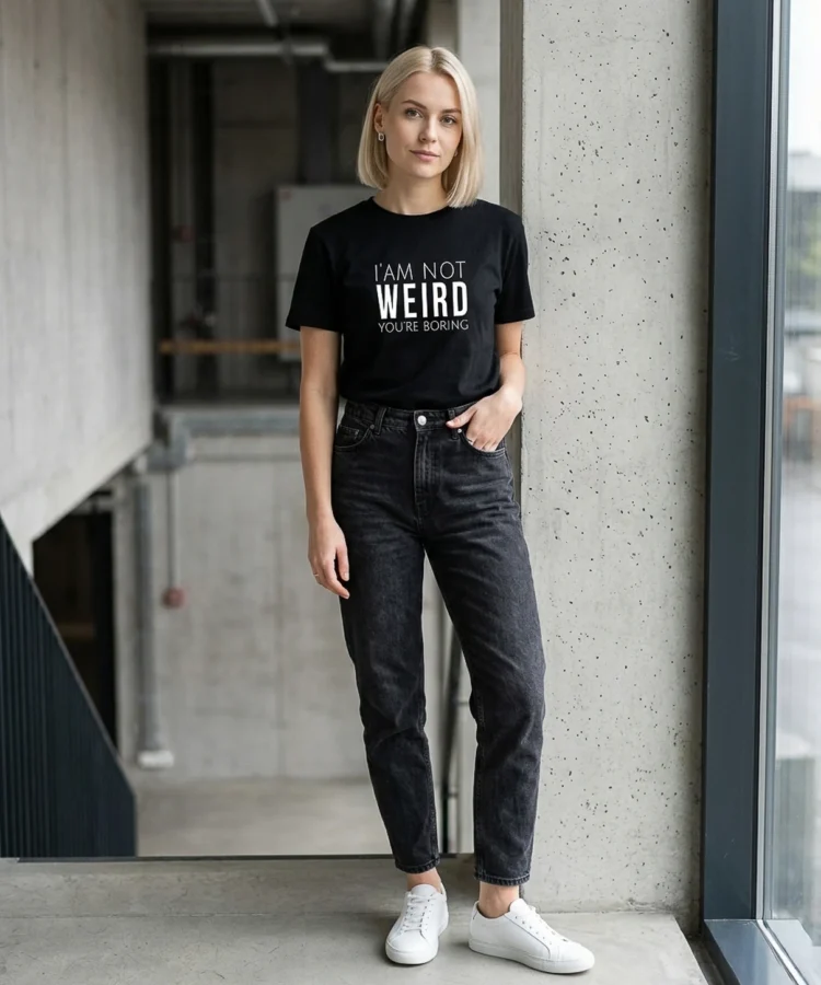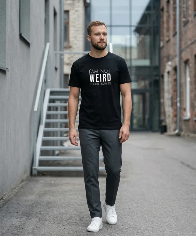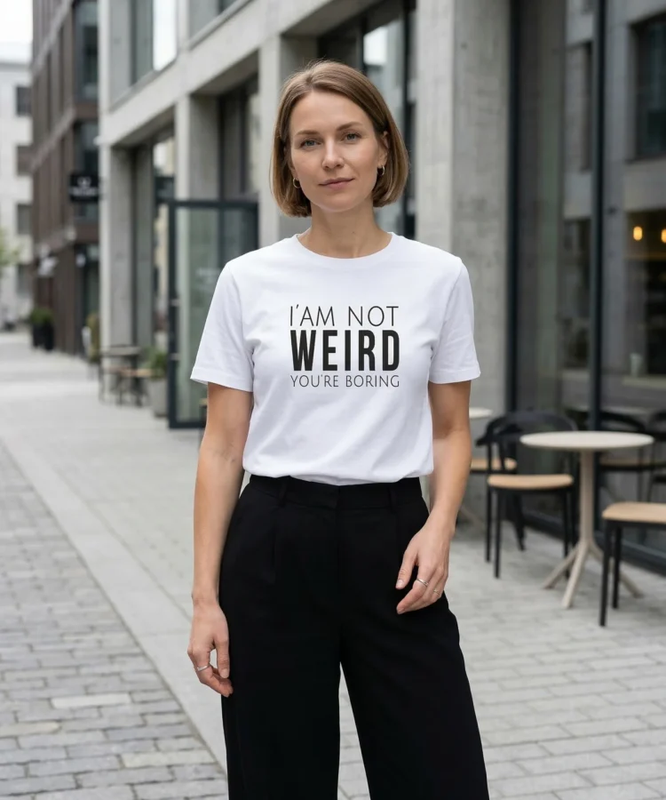 I’M NOT WEIRD, YOU’RE BORING — perspektiivipööre ühe lausega. Mitte sina oled probleem, vaid nemad on liiga tavalised. Kuiv humor, otsene sõnum, null vabandamist.