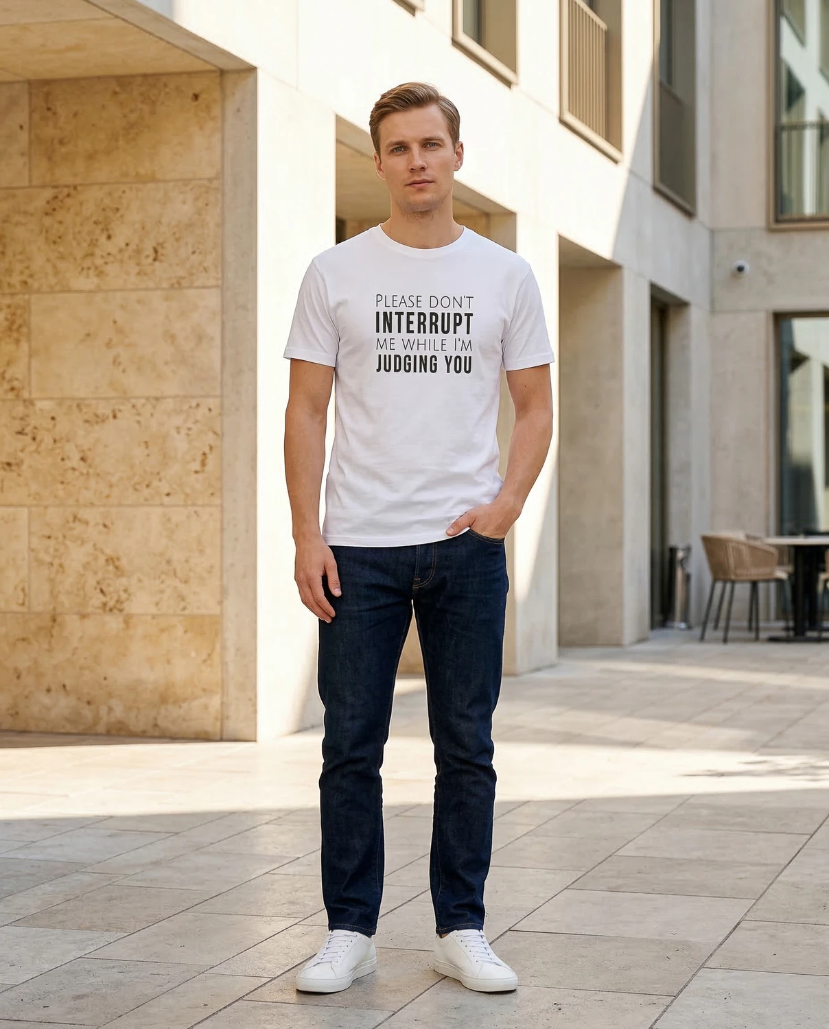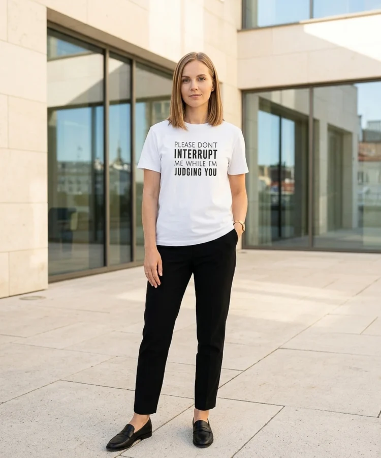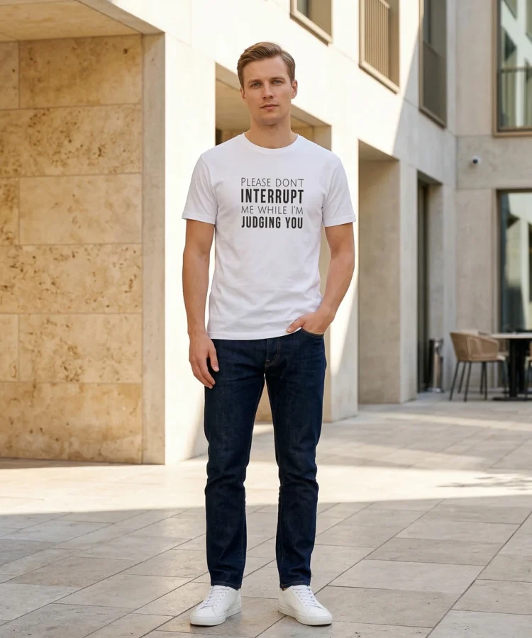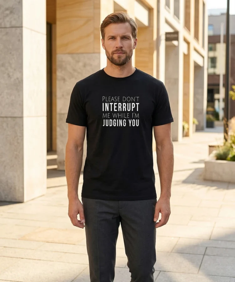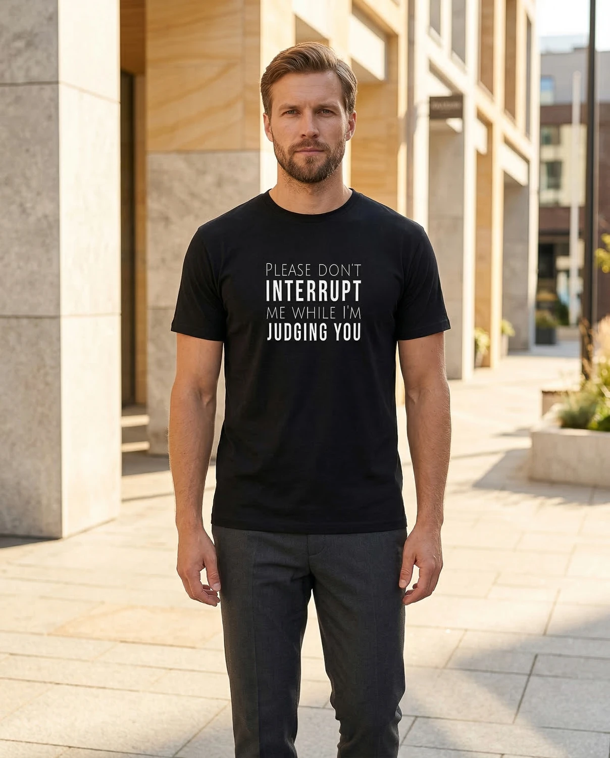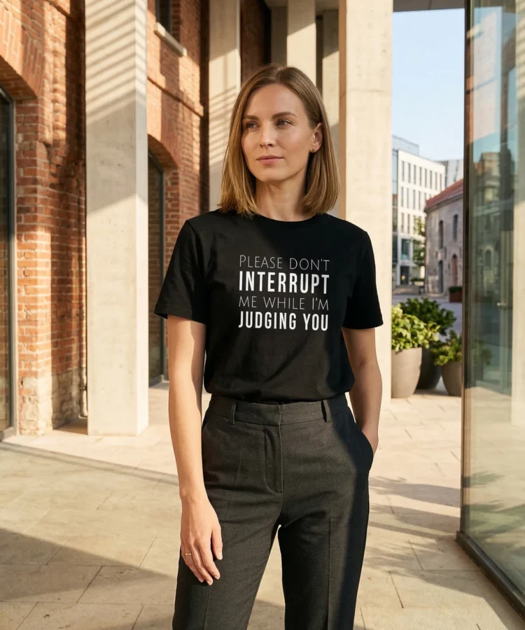 Rõhk on sõnadel INTERRUPT ja JUDGING YOU — see pinge nende vahel teeb kogu töö. Kanna seda ja jälgi, kuidas inimesed oma näoilmet kontrollida püüavad. Sarkasmi ja otsekohesuse fännidele, kellel on sisemonoloog, mis väärib publikut.
