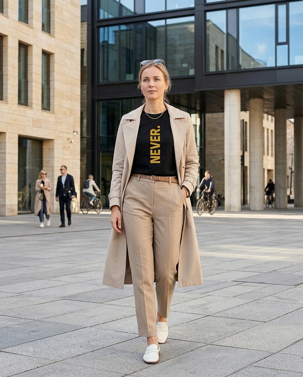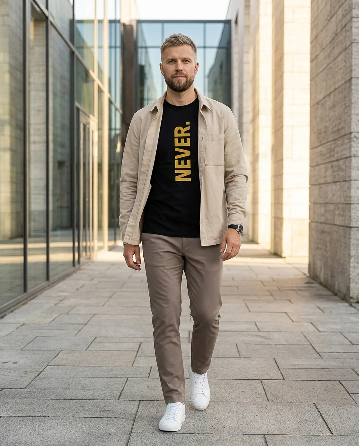 Trükk: vertikaalne “NEVER.” keskjoonel