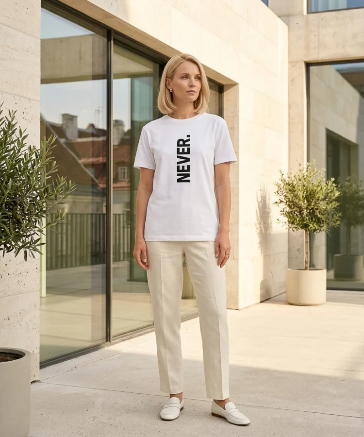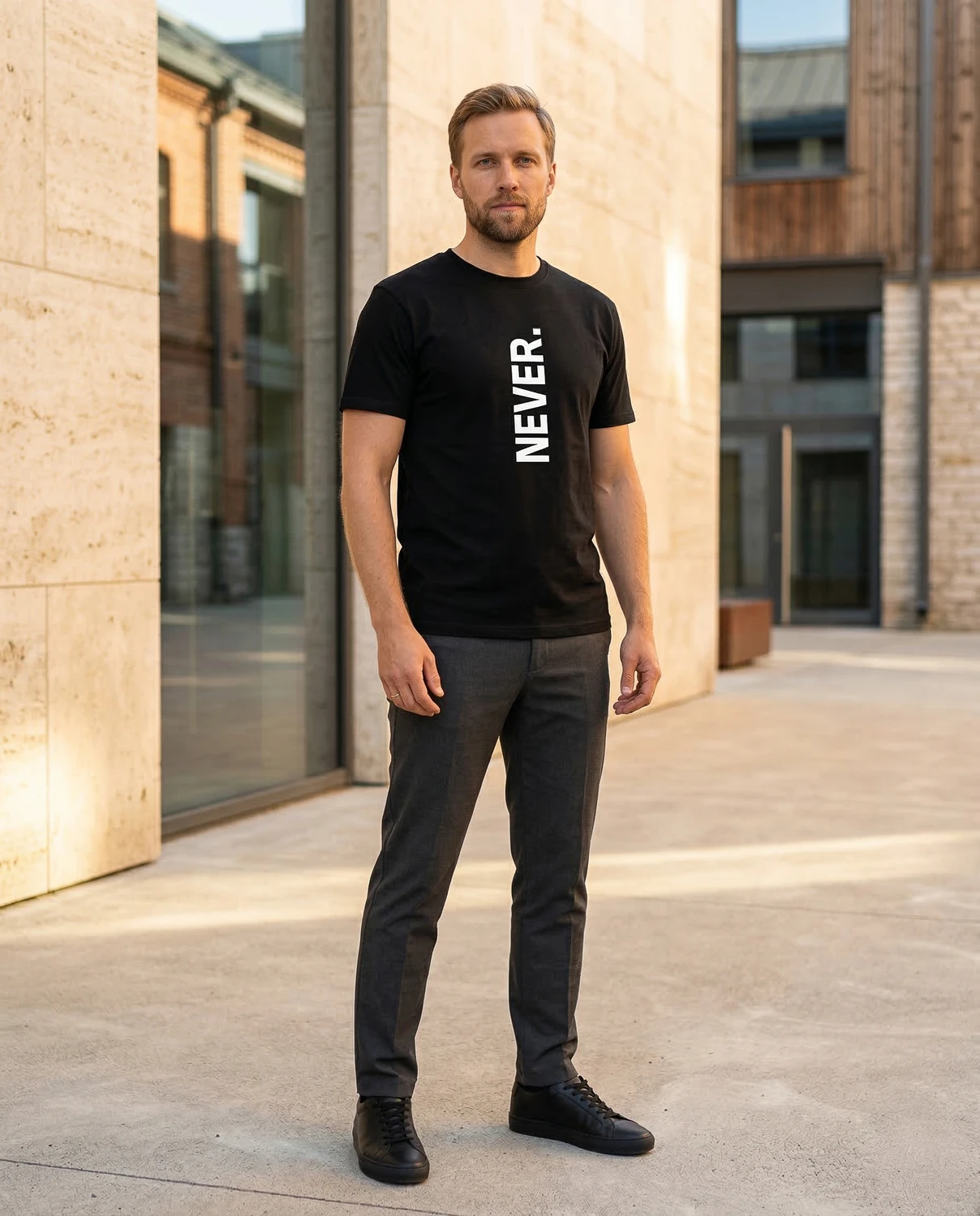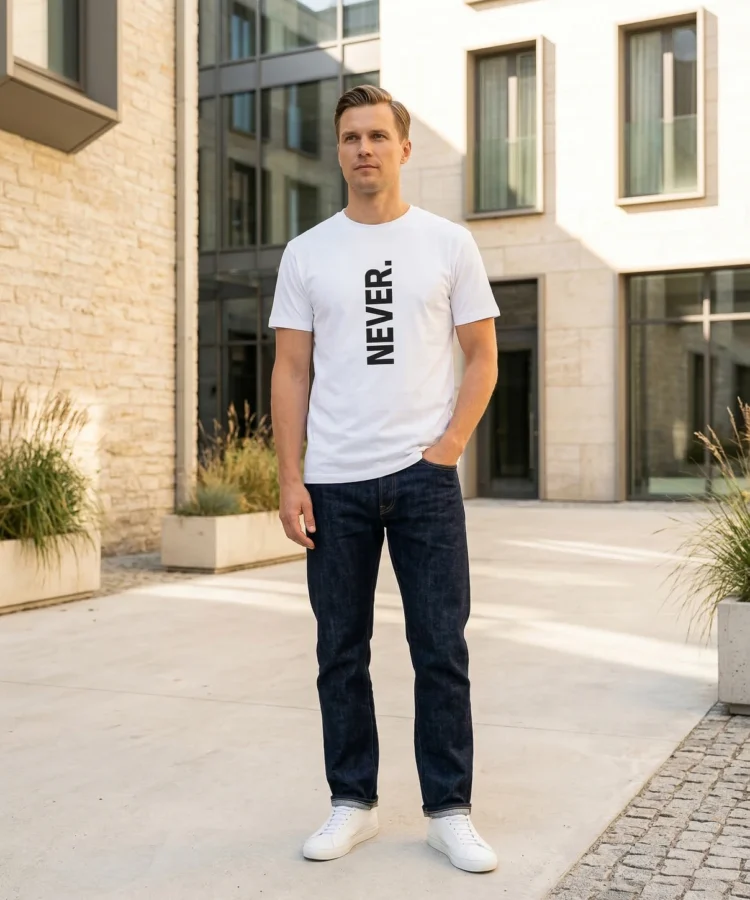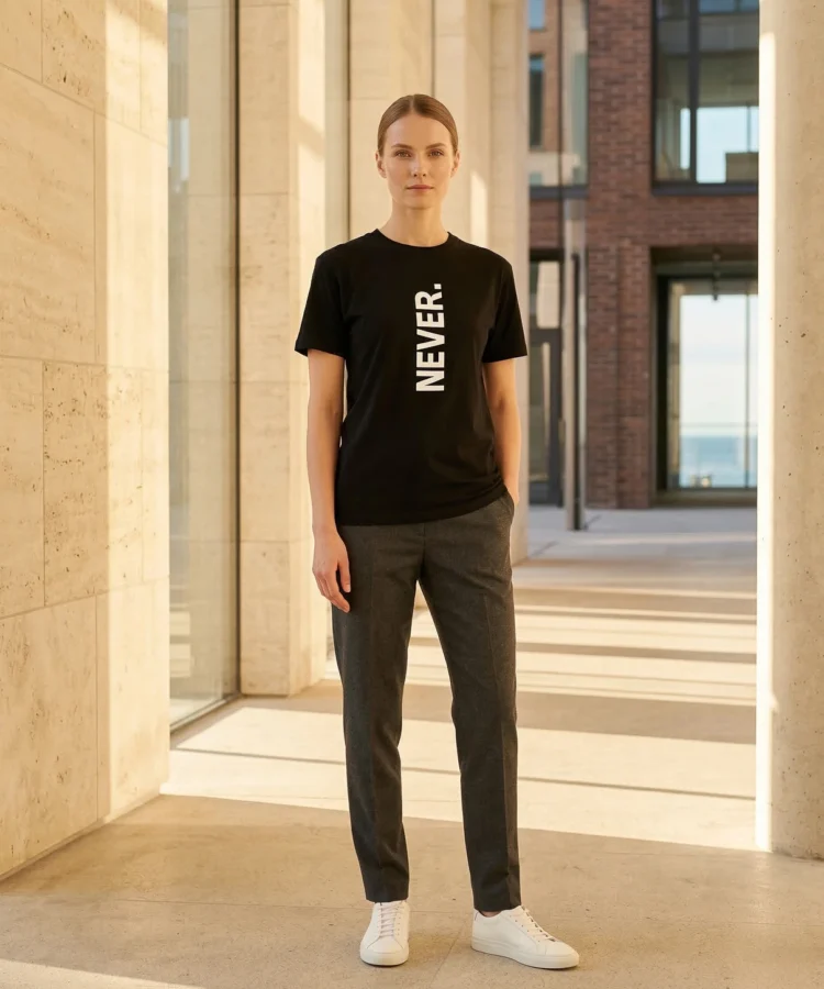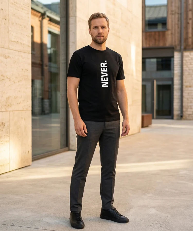NEVER. — üks sõna, vertikaalselt, punktiga. Kõik muu on sinu asi. Keeldumise manifest, otsuse kinnitus või lihtsalt üks sõna, mis istub hästi — sõltub päevast ja kandjast.