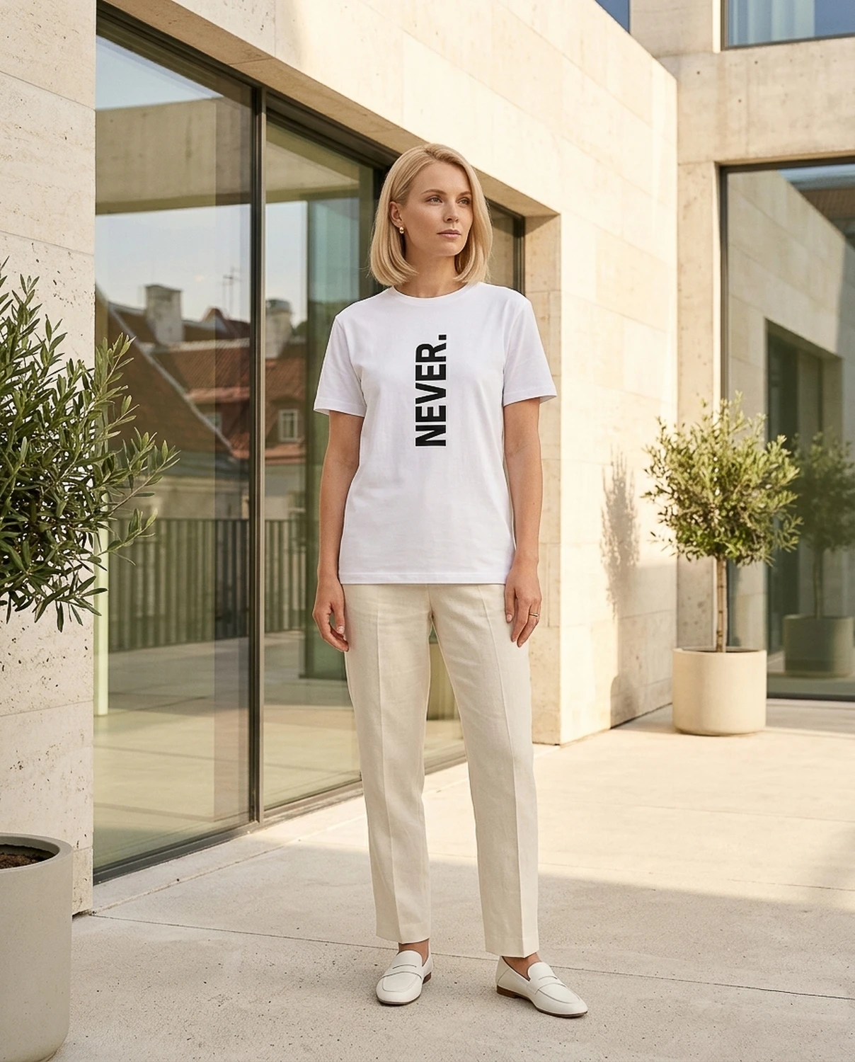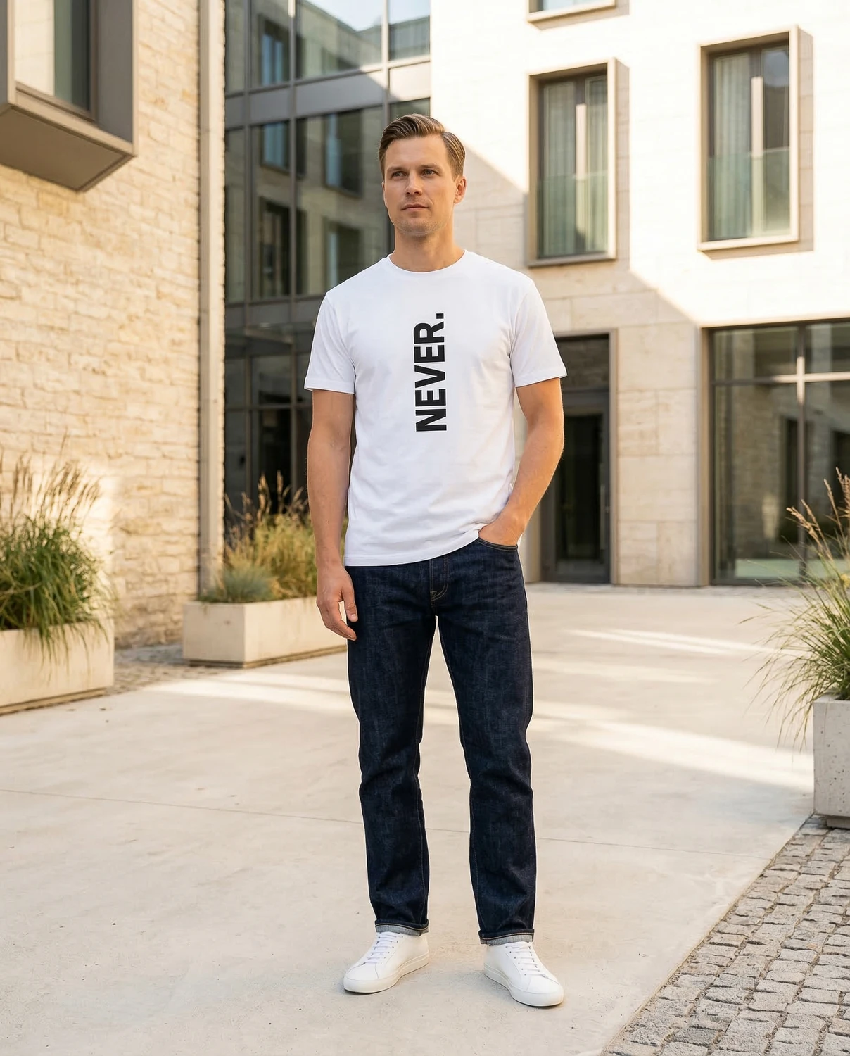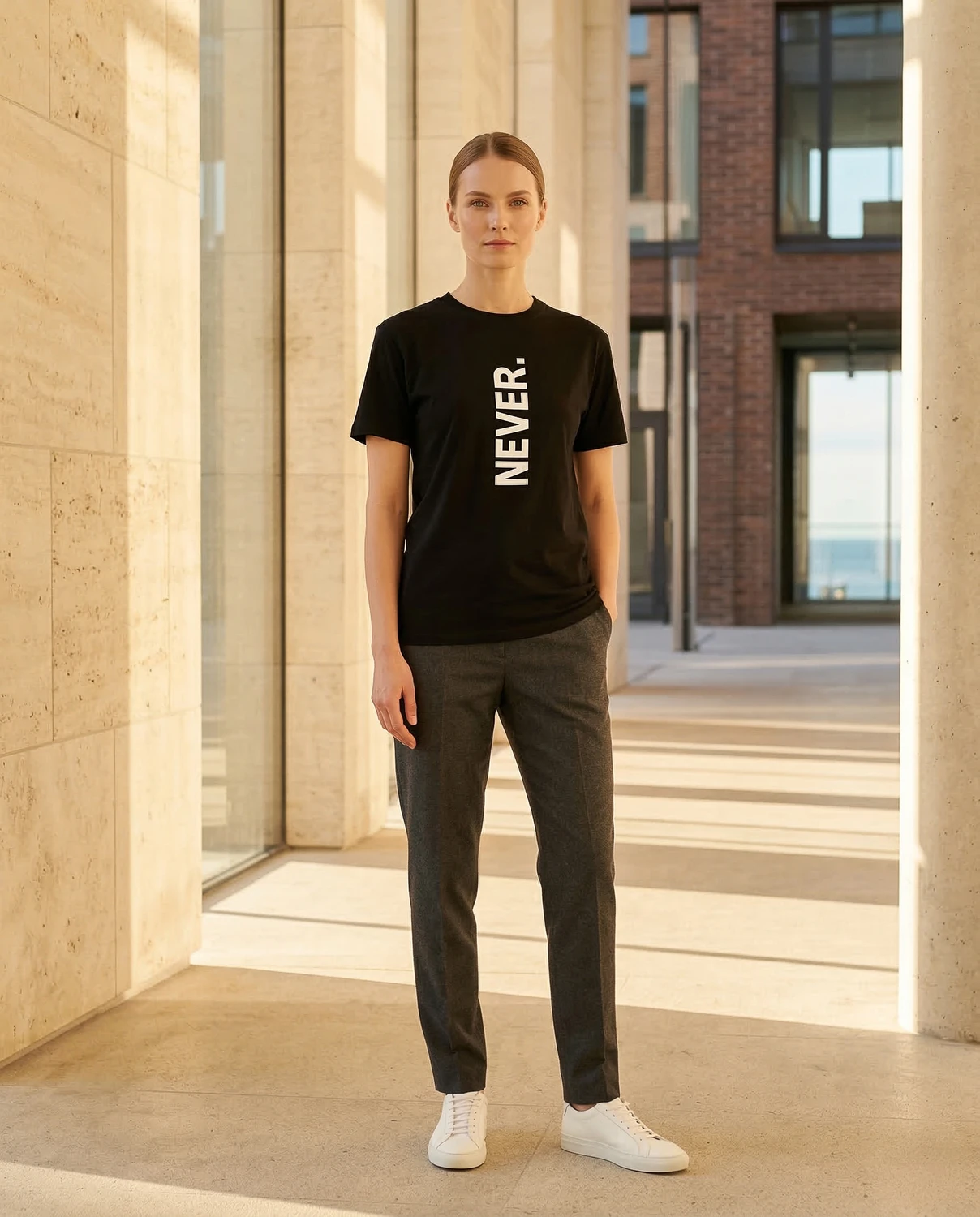 NEVER. — üks sõna, vertikaalselt, punktiga. Kõik muu on sinu asi. Keeldumise manifest, otsuse kinnitus või lihtsalt üks sõna, mis istub hästi — sõltub päevast ja kandjast.