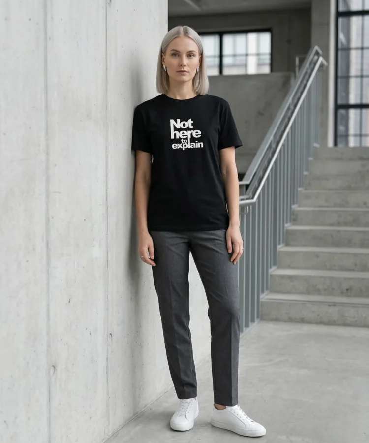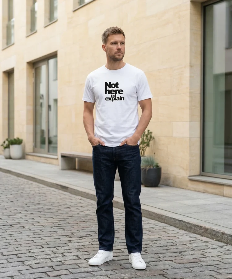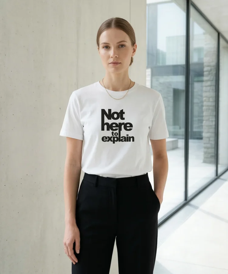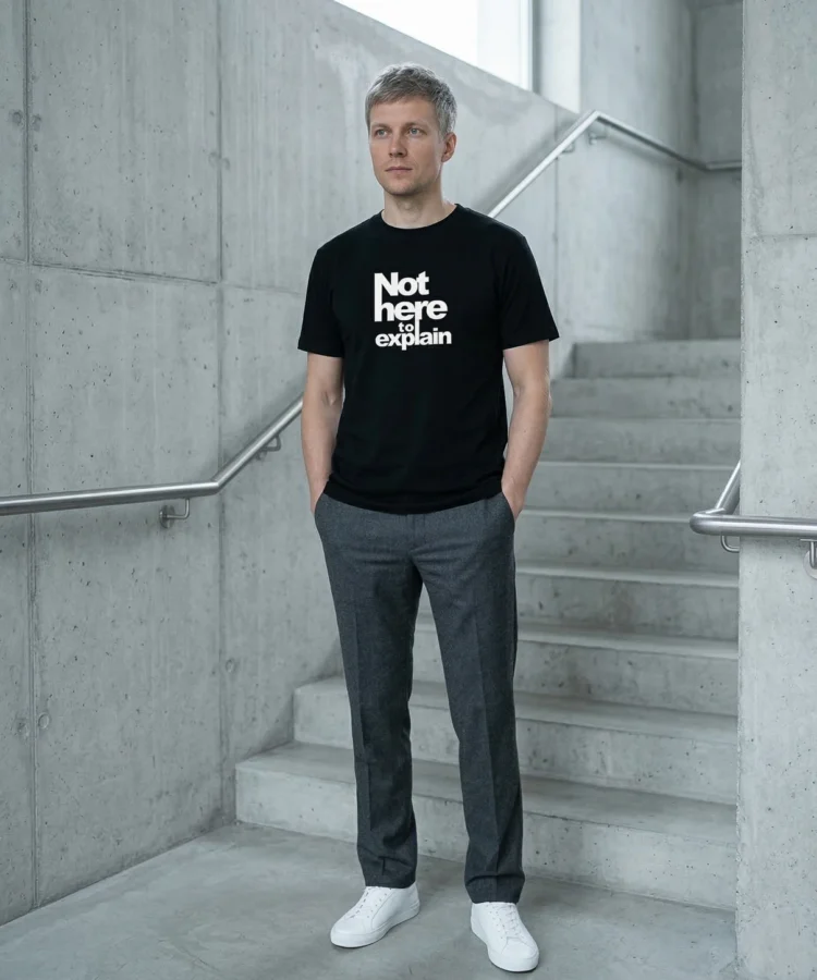 NOT HERE TO EXPLAIN — seletamise väsimus ühes lauses. Mitte ülbus, vaid piir. See särk on neile, kes on tüdinenud end õigustamast, lahti seletamast ja tõestamast.