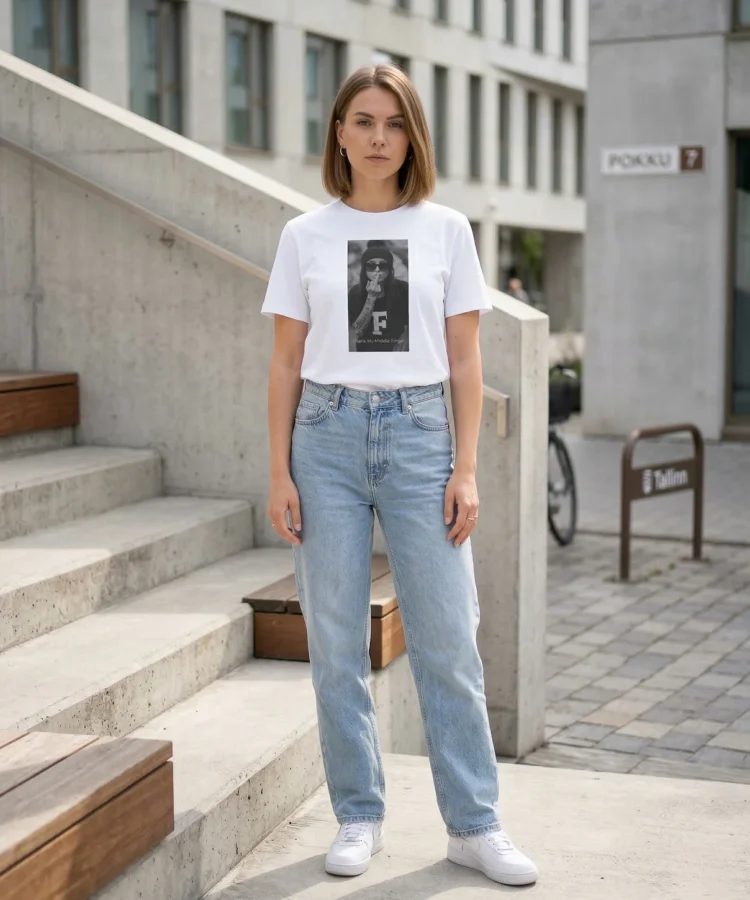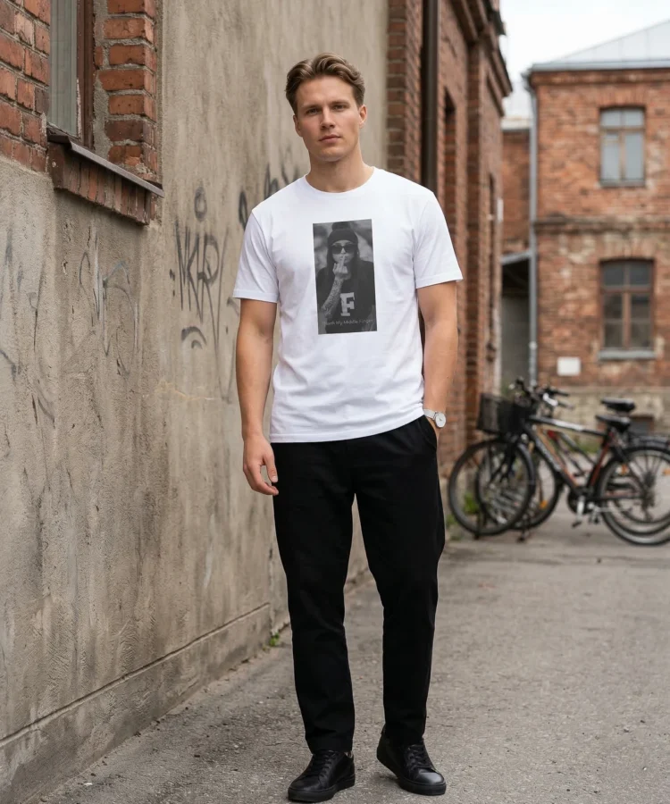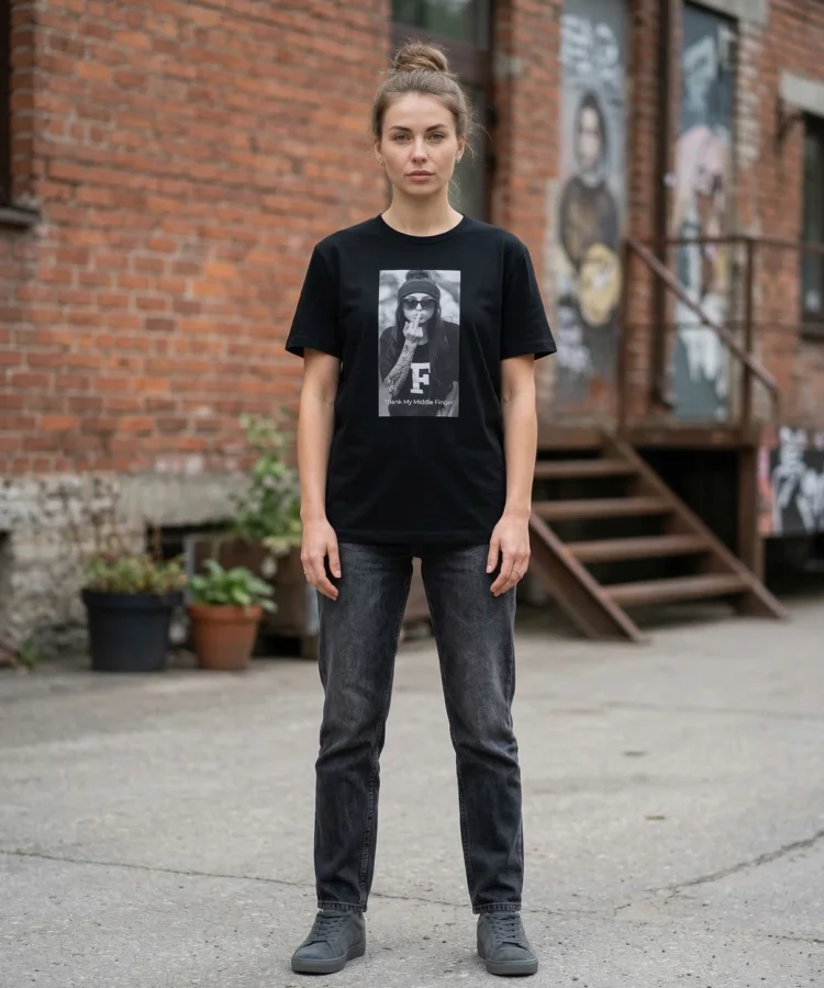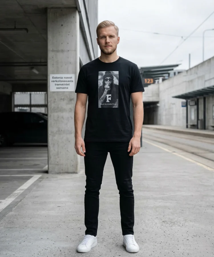 Thank my middle finger — keskmine sõrm ei ole roppus. See on piir. See on hetk, kus sa lõpetad vabandamise ja hakkad enda eest seisma. Fotopõhine disain, must-valge, aus ja terav.