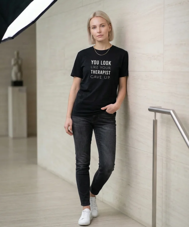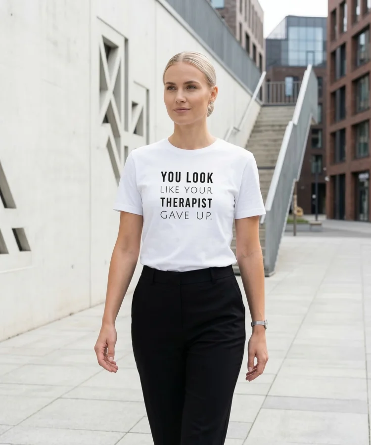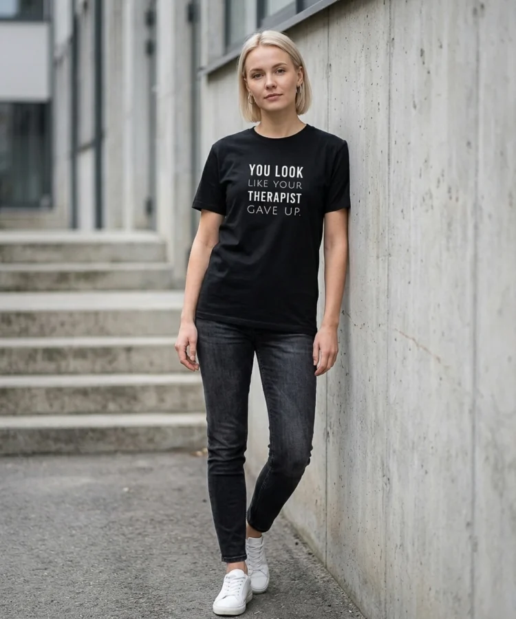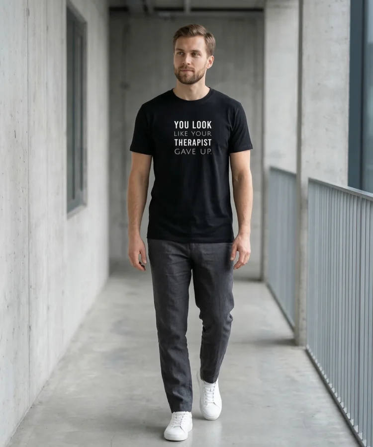 YOU LOOK LIKE YOUR THERAPIST GAVE UP — jah, see on nii julm kui paistab. Aga ka nii naljakas. See särk on punchline, mis ei vaja setup’i — kanna seda ja jälgi, kuidas inimesed püüavad mitte naerda. Ebaõnnestuvad.