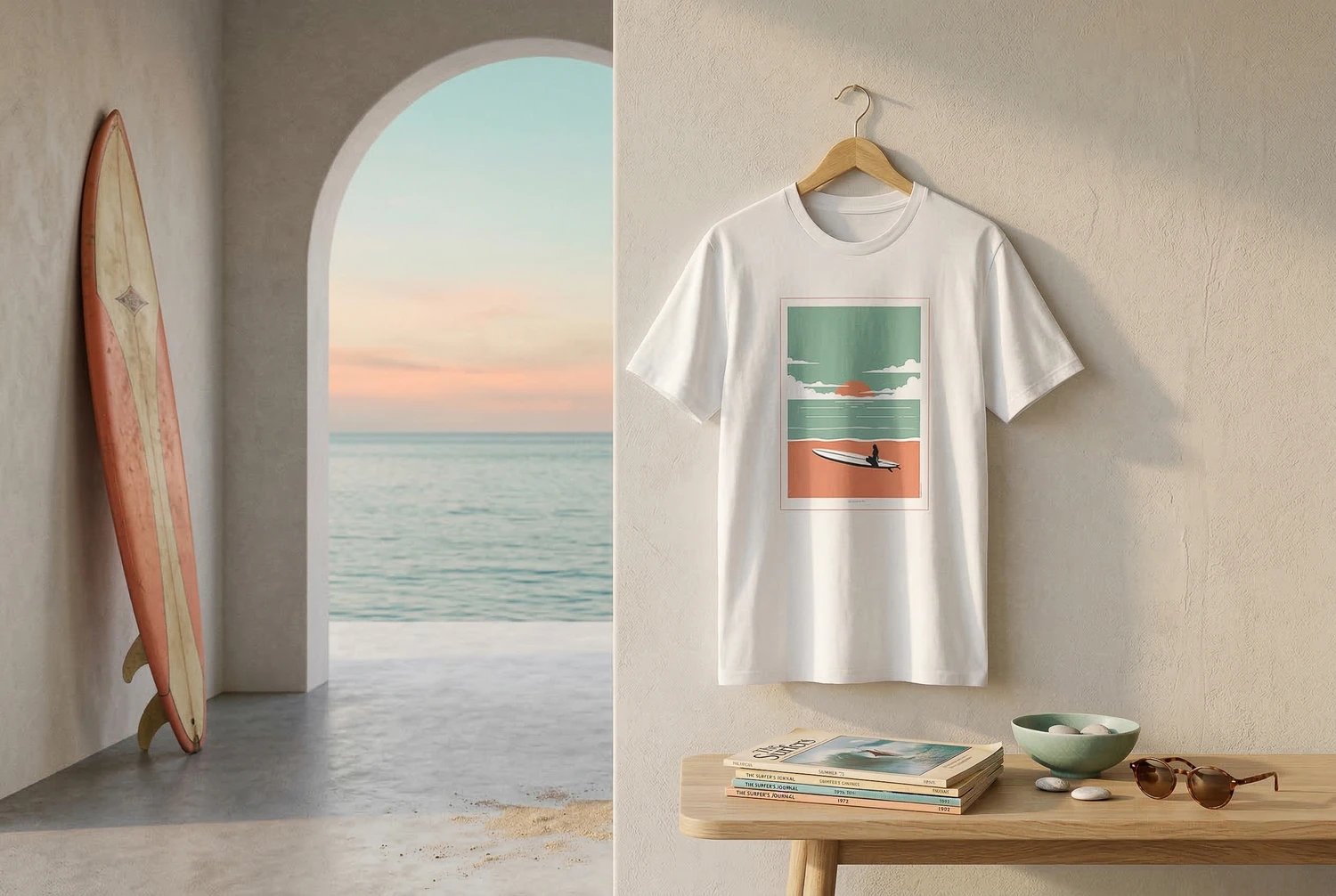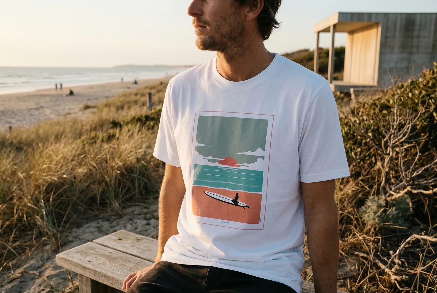 Illustratsioonid. „Summer ’72 Surfer Sunset” on retro surfiplakat T-särgil – päikeseloojang mererohhelises ja korallpunases, longboard liival, siluett, mis vaatab horisonti. See ei ole fotograafia ega tüpograafia – see on graafiline illustratsioon, mis kannab meeleolu ilma ühegi sõnata.