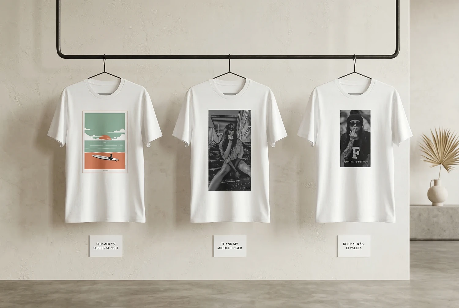 Fotopõhised disainid. „Thank My Middle Finger” ja „Kolmas Käsi Ei Valeta” kasutavad mustvalgeid fotosid kangal – tänavalik, toores, natuke häbematu. Ma olen olnud fotograaf üle 18 aasta ja mu tugevus on alati olnud atmosfäärsetes, tänavafotograafilistes kaadrites. Need särgid on koht, kus mu kaks maailma – fotograafia ja rõivadisain – päriselt kokku saavad. Foto kangal ei ole poster. See on osa riietusest, mis liigub sinuga kaasa.